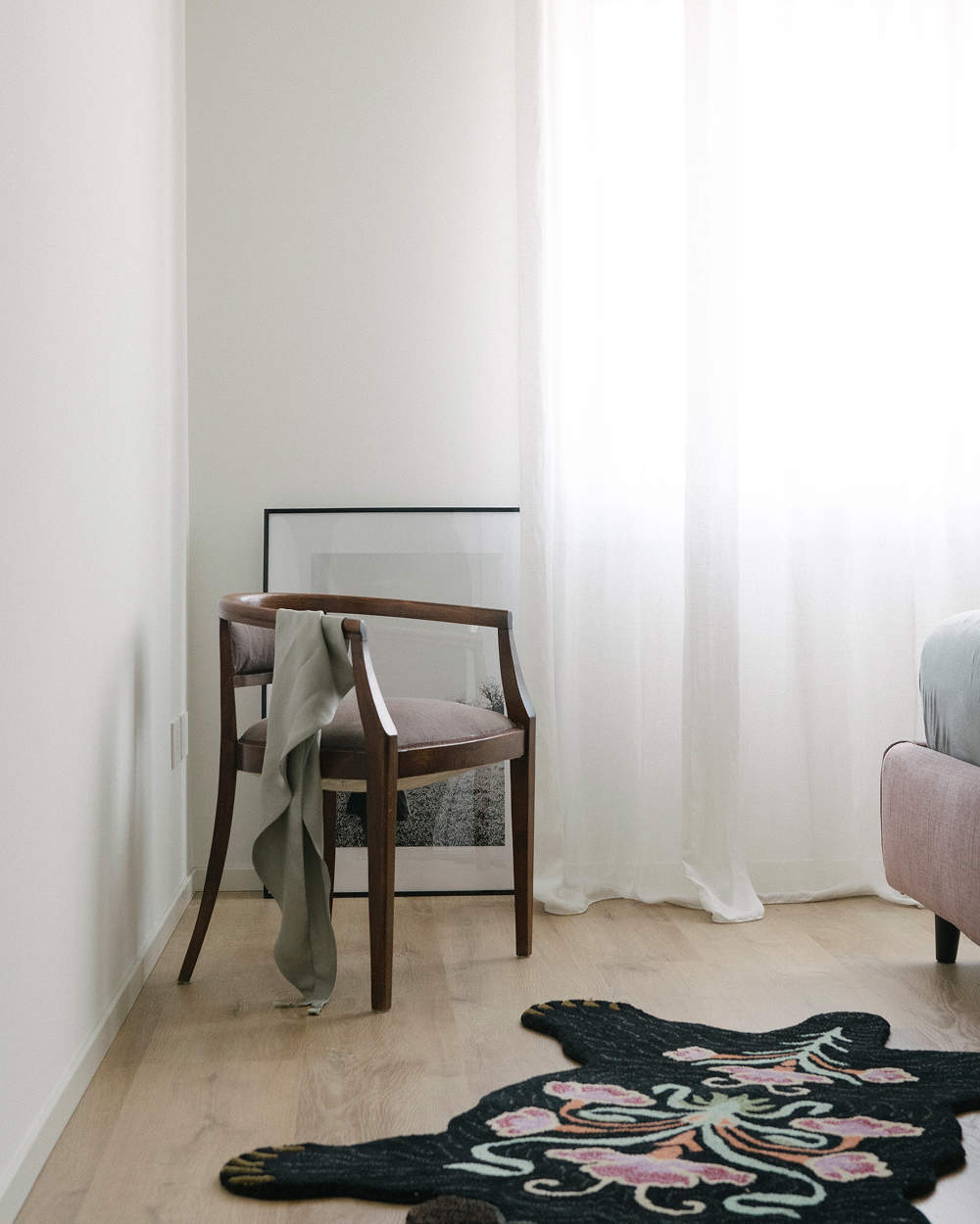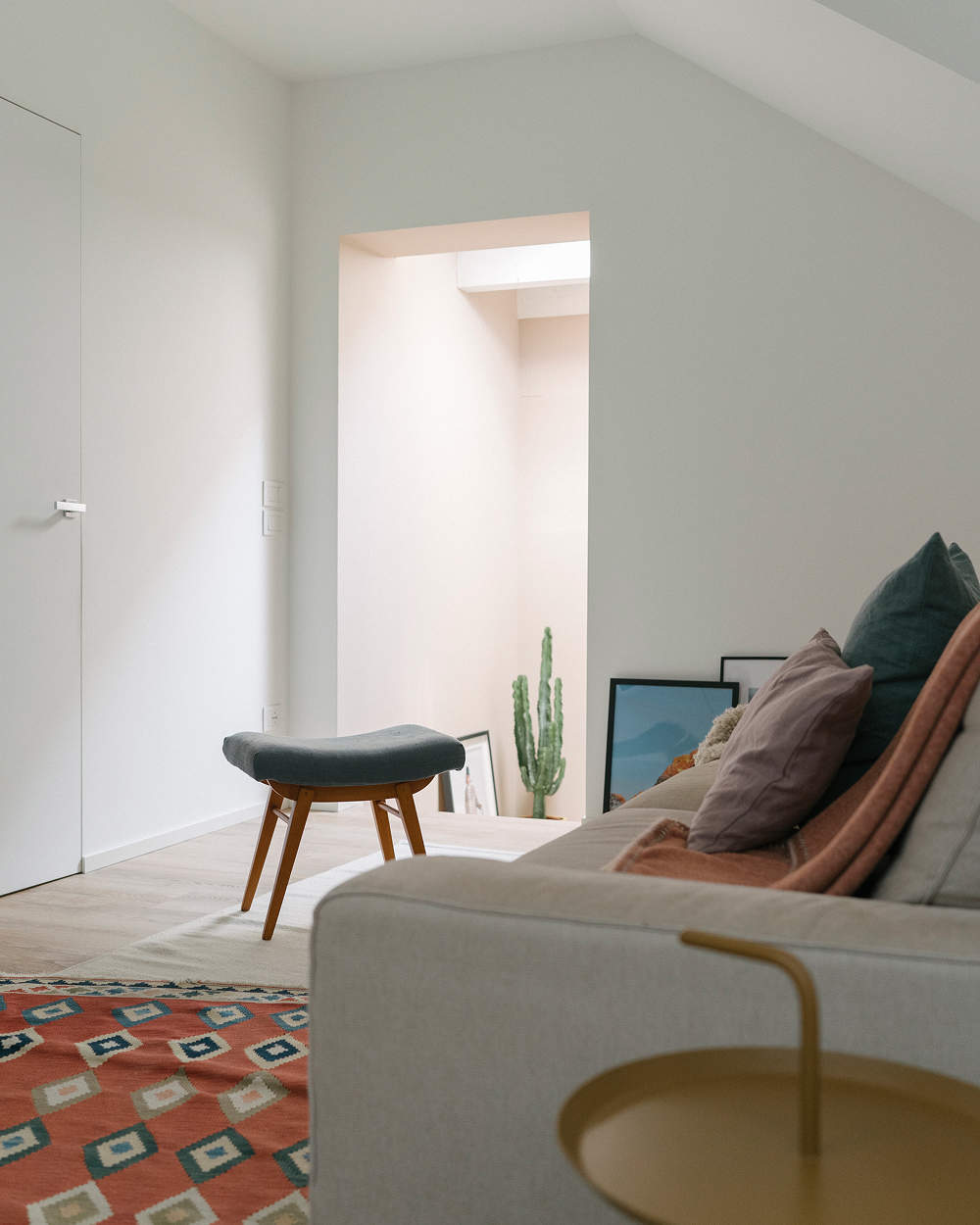 La zona giorno con cucina a vista diventa il fulcro dello spazio, pensato per valorizzare la luce naturale e il dialogo tra volumi, materiali e colore. Oggetti di design contemporaneo si affiancano a pezzi vintage, creando un equilibrio caldo e autentico.