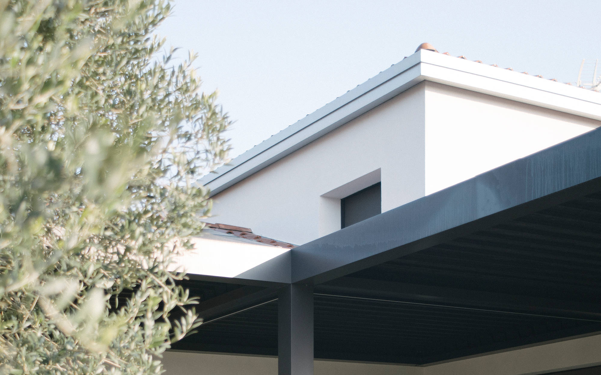 La palette materica è volutamente sobria: intonaci chiari e grigi, serramenti e schermature dalle tonalità neutre, dettagli metallici scuri. Ogni scelta concorre a definire un linguaggio discreto, capace di valorizzare il rapporto tra architettura e contesto naturale senza sovrapporsi ad esso.