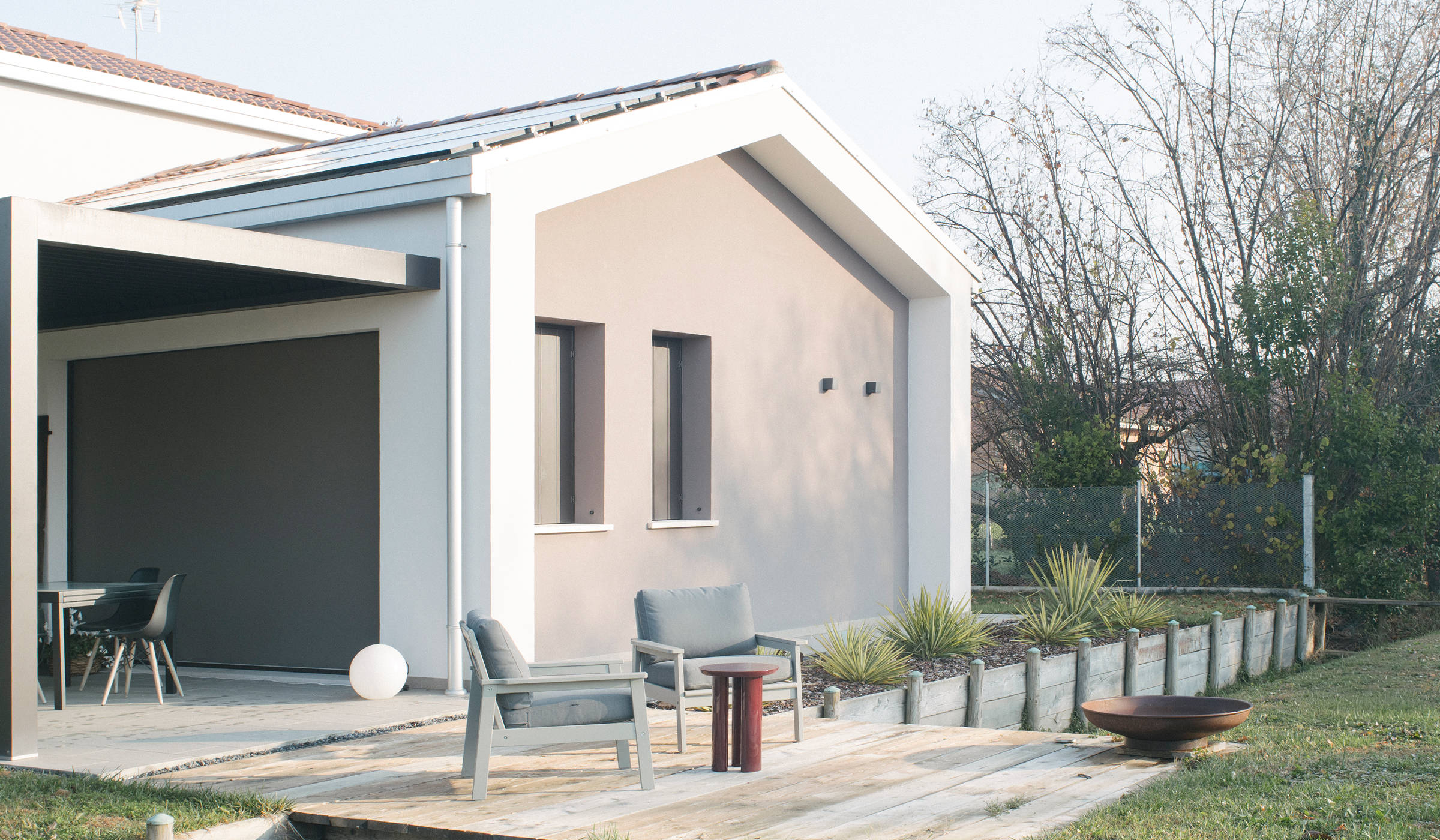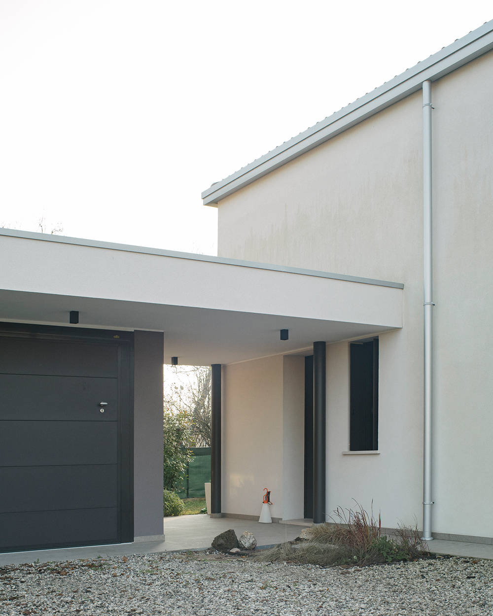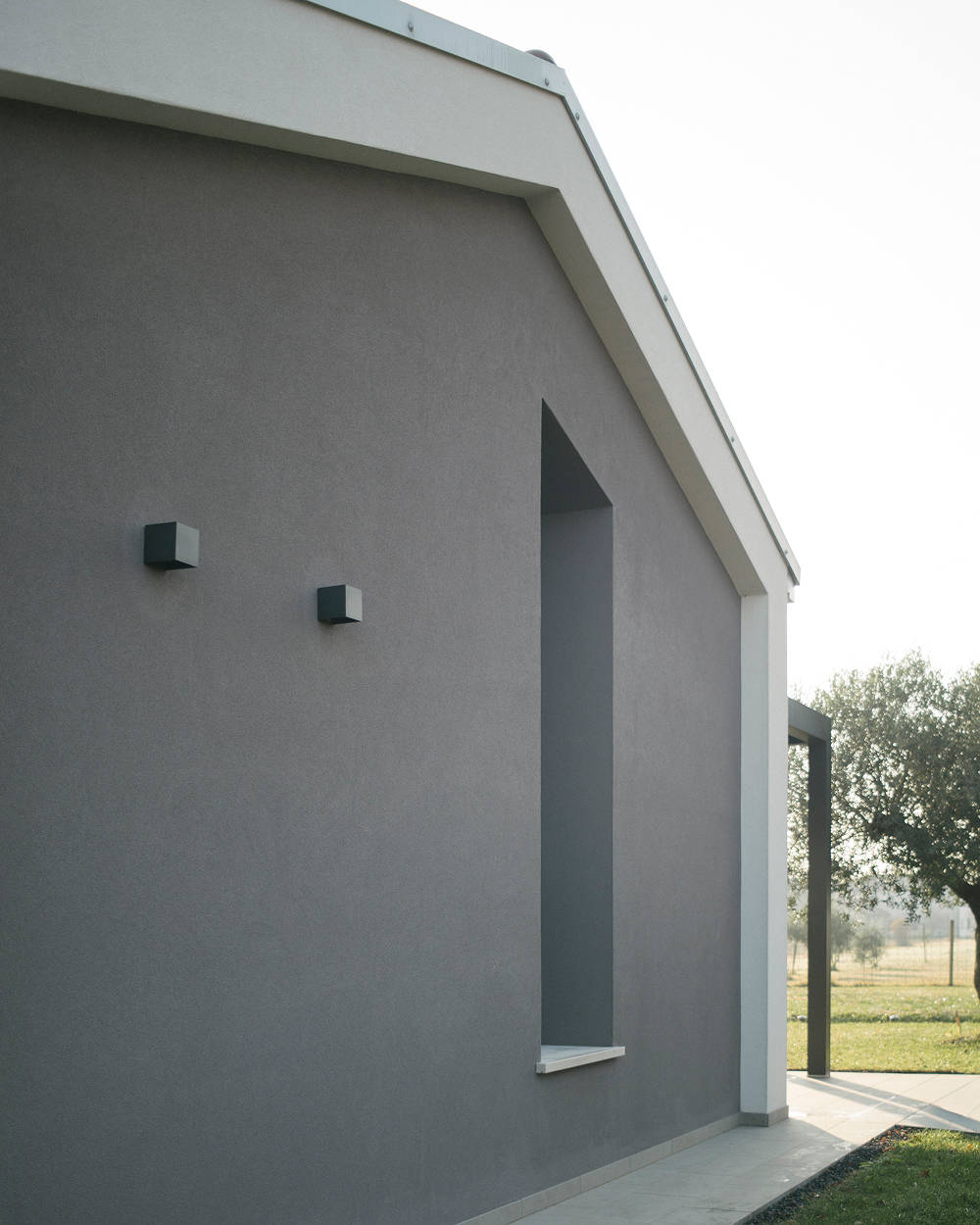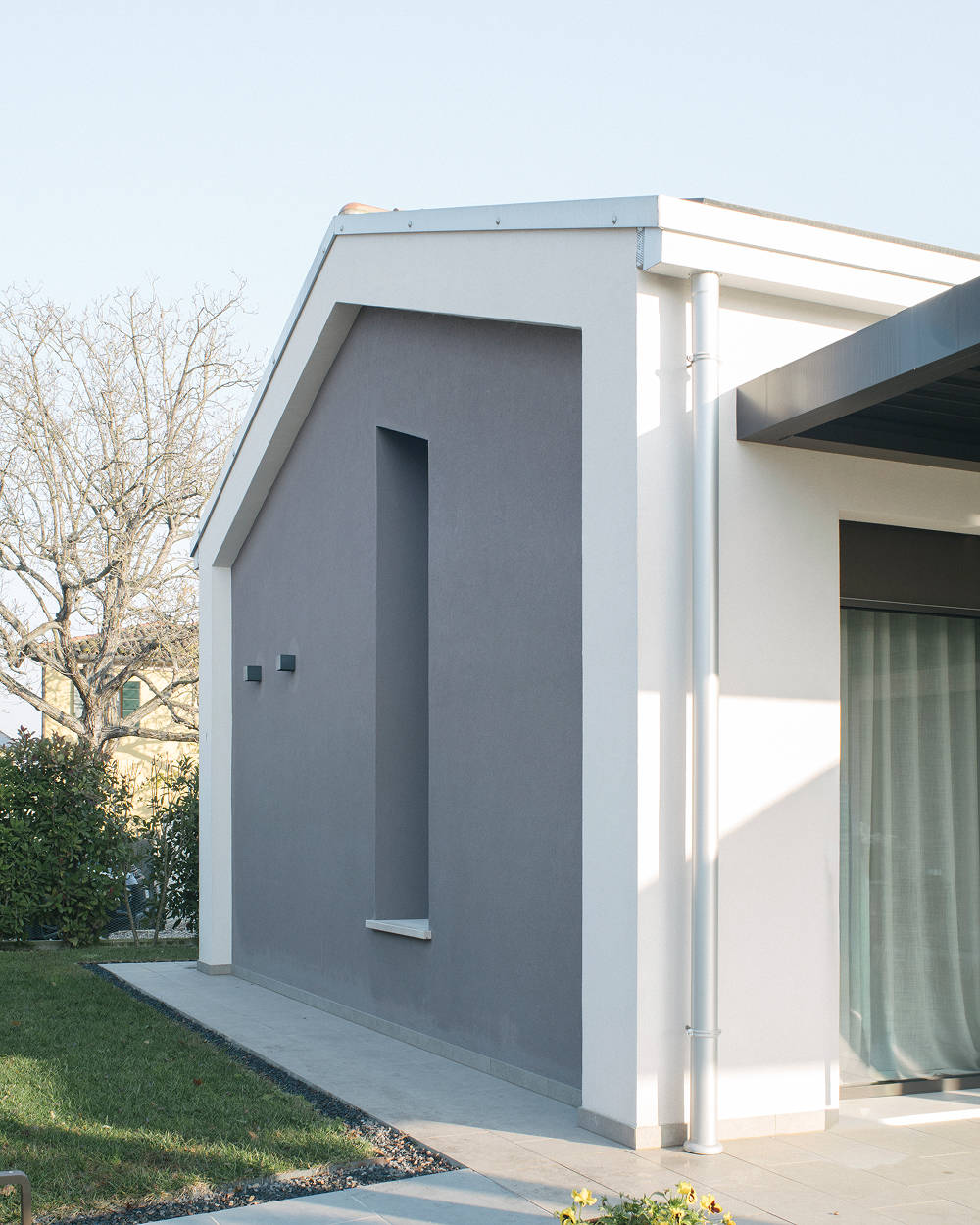 Il corpo principale, compatto e rigoroso, è affiancato da un volume secondario più leggero che accoglie gli spazi di relazione e si apre verso il giardino. La composizione è scandita da linee nette, aggetti misurati e una copertura a falde reinterpretata come elemento architettonico essenziale.