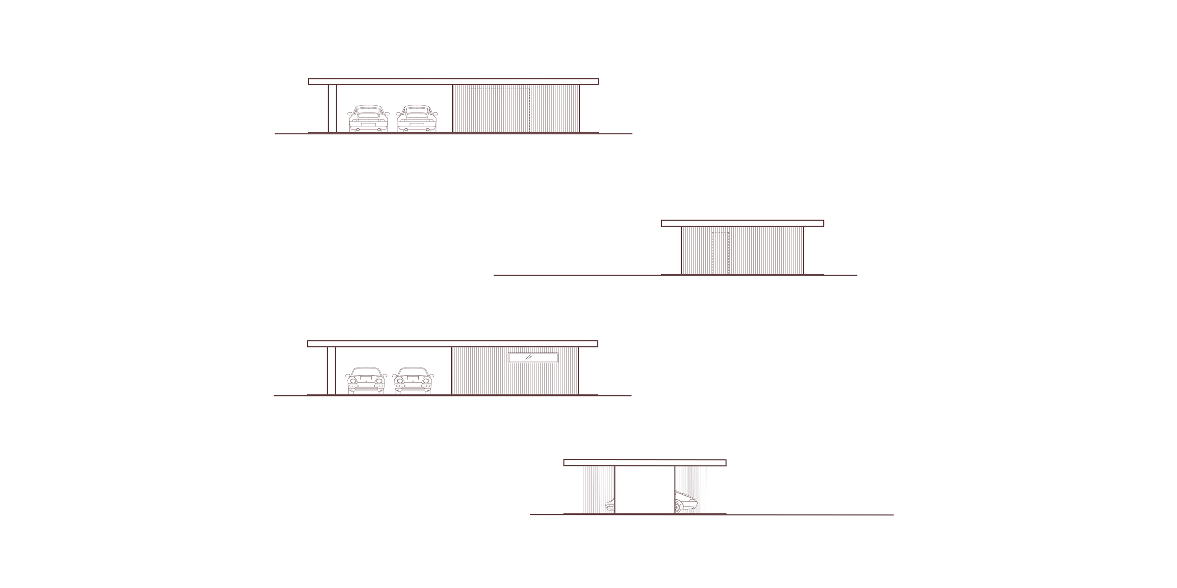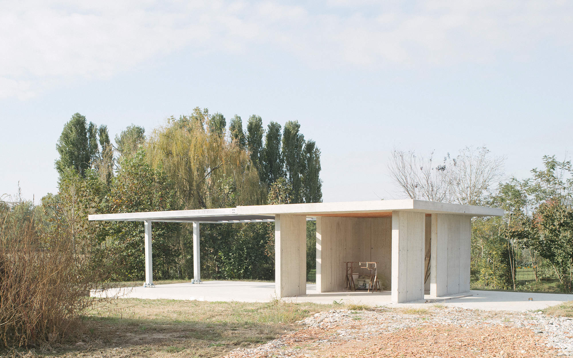É stato progettato un nuovo volume destinato a garage che si inserisce con discrezione nel giardino, con un linguaggio architettonico contemporaneo ma rispettoso. Le linee pulite della copertura piana in cemento e il rivestimento in doghe di larice, destinate a mutare nel tempo, instaurano un dialogo cromatico e materico con il contesto, sottolineando la volontà di integrazione paesaggistica.