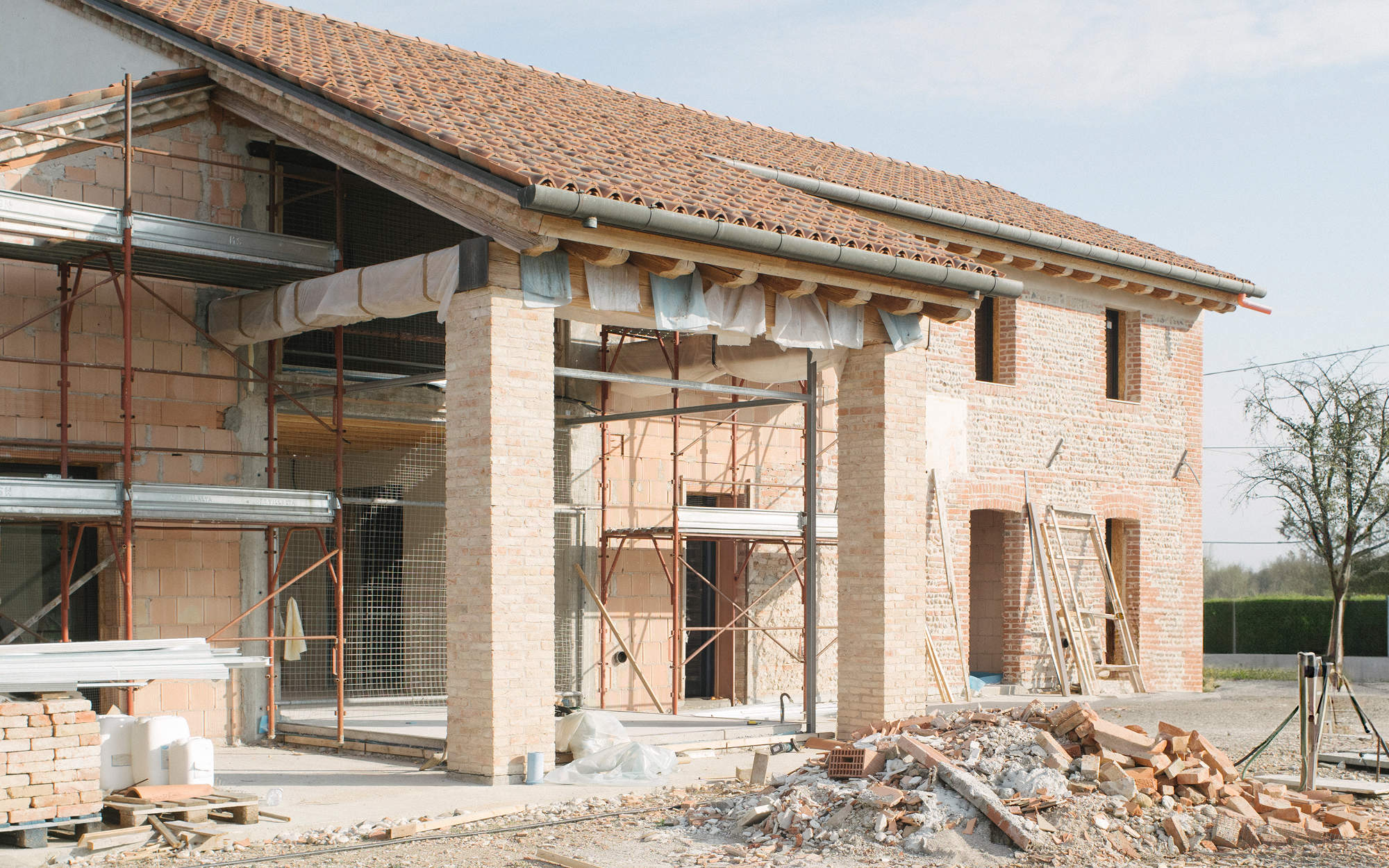 Il progetto si fonda sul rispetto profondo per l’edificio originario dei primi anni del 900, e sulla volontà di instaurare un dialogo armonioso tra passato e contemporaneità. Le facciate esterne sono state preservate con cura, mantenendo intatta l’identità materica e formale del casale. Gli interventi si concentrano sull’interno, la distribuzione si sviluppa su due livelli. Al piano terra, gli ambienti conviviali si aprono l’uno sull’altro in una successione fluida e naturale: la zona giorno, la cucina, il bagno per gli ospiti, sapientemente nascosto all’interno di un volume armadi passante all’ingresso. Completano il piano una lavanderia e un locale tecnico di servizio.