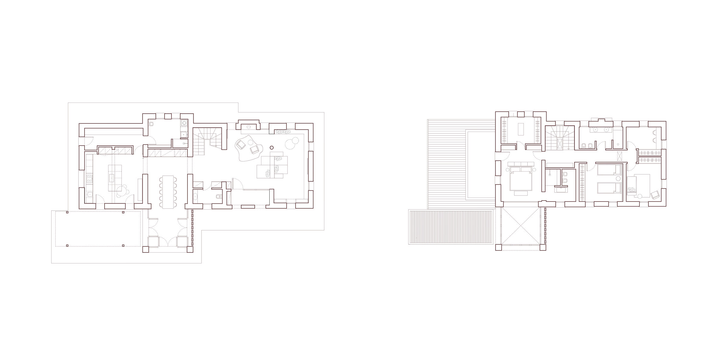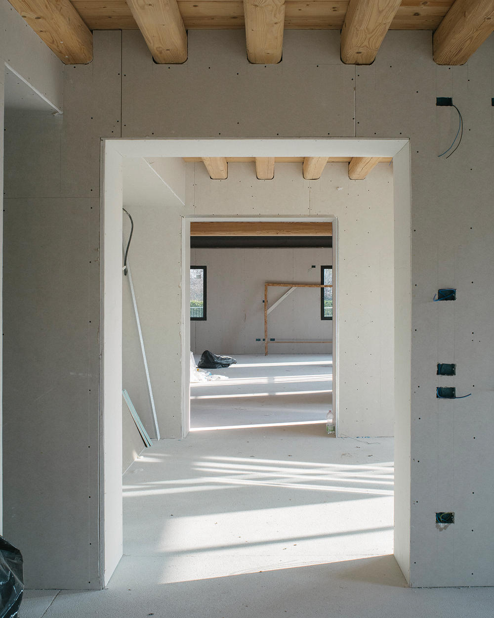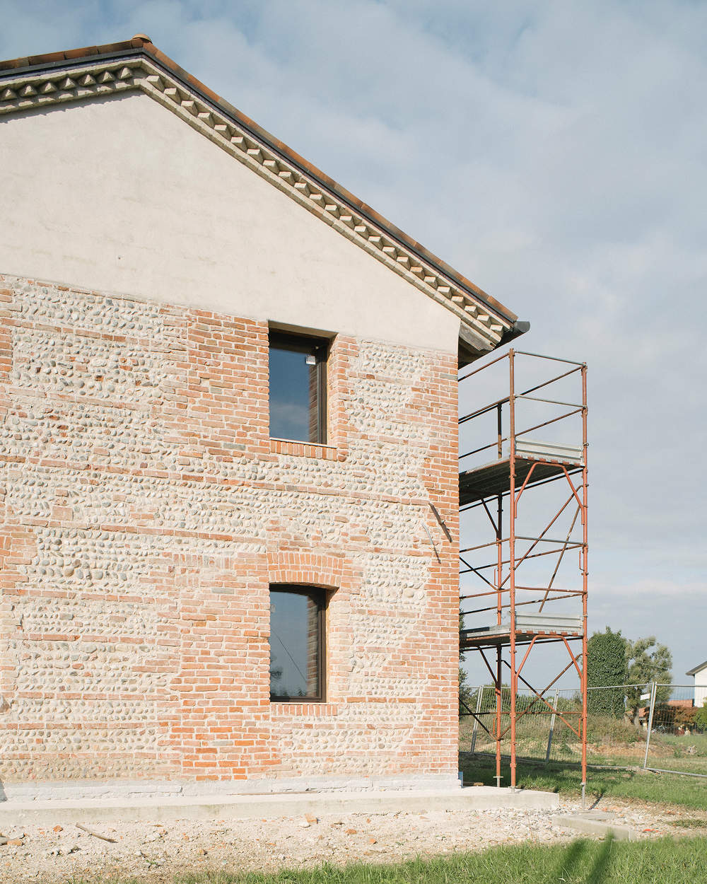 Elemento centrale del progetto è la chiusura del portico con una struttura vetrata a doppia altezza che ospita la zona pranzo. Una “serra abitata” che raccoglie la luce naturale e incornicia il paesaggio, creando un continuo visivo tra interno ed esterno, tra costruito e natura. Al piano superiore si trovano tre camere da letto. La suite padronale è dotata di bagno privato e ampia cabina armadio affacciata sulla serra vetrata, in un gioco di trasparenze e altezze che amplifica la percezione dello spazio. Completano il piano un secondo bagno e uno studio.